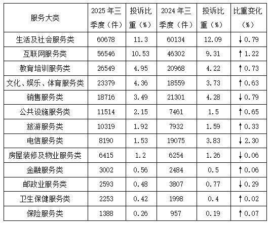 根据2025年三季度服务大类投诉数据,生活及社会服务类、互联网服务类、教育培训服务类、文化娱乐体育服务类、销售服务类居于前五位。与2024年三季度相比,互联网服务类,教育培训服务类,公共设施服务类投诉量比重上升,电信服务类,销售服务类,生活及社会服务类投诉量比重下降。