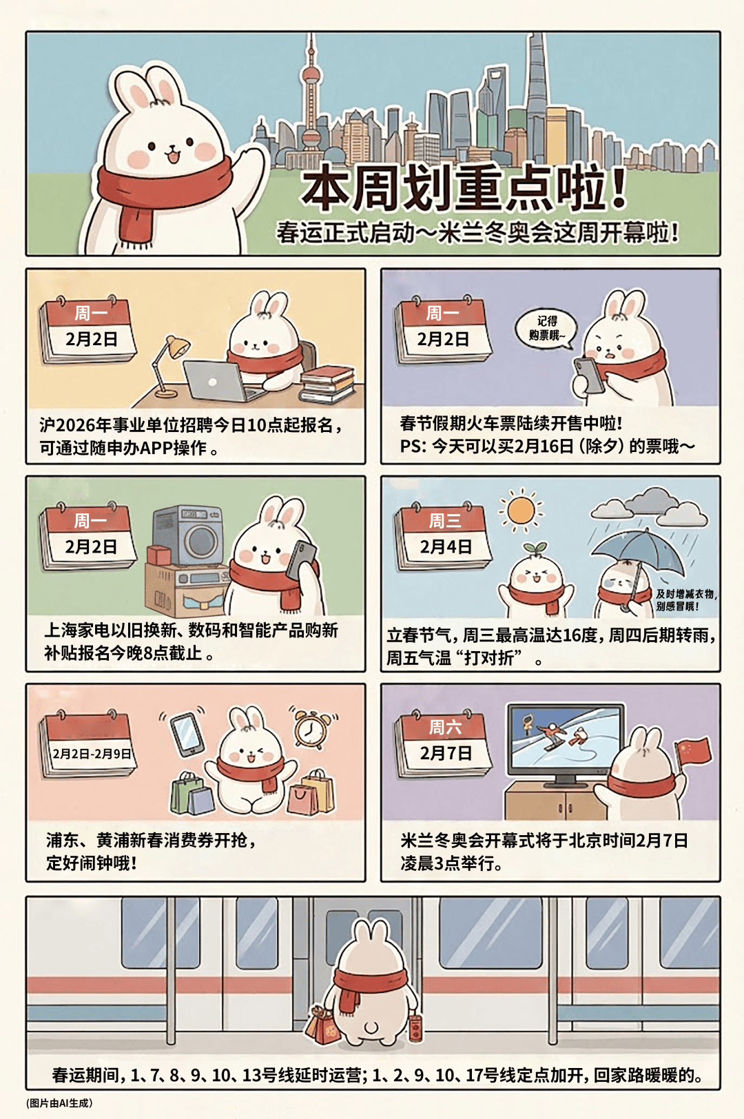 市第十六届人大四次会议、市政协十四届四次会议本周举行,2026年春运今天正式启动,春节假期火车票陆续开售中,今天可以购买2月16日(除夕)的火车票,沪2026年事业单位招聘今日10点起报名,周三立春节气……本周还有哪些大事?速看本周提示↓